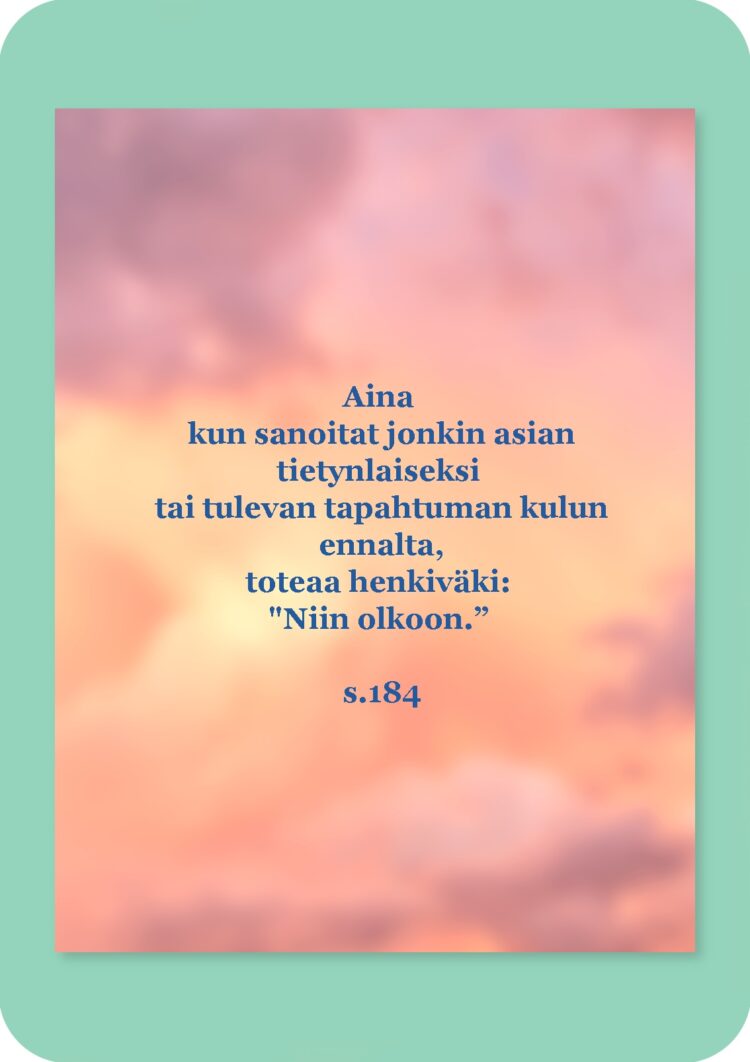Uusin Näkijä -kirja saa rinnalleen 44 korttia, jotka saattelevat kirjan aatoksien äärelle. Voit nostaa kortin tietylle asialle, ihmiselle, tilanteelle, tapahtumalle tai tälle päivälle. Korteissa on sivunumerot, joiden avulla löydät kohdan kirjasta. Ihana lahja myös hänelle, joka ei tapaa lukea koko kirjaa. Oman korttisi pääset kääntämään tästä.
